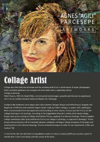 Collage describes both the technique and the resulting work of art in which pieces of paper, photographs,